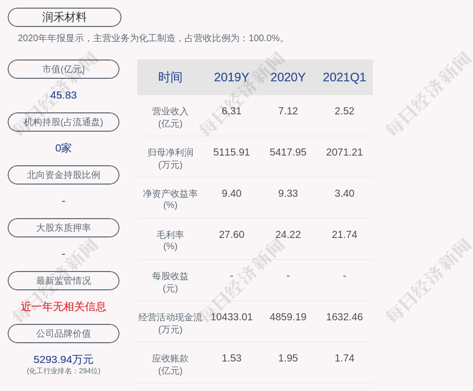 2020年年报显示,润禾材料的主营业务为化工制造,占营收比例为:100.0%。