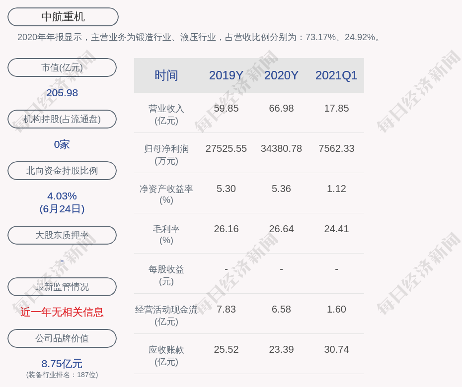 2020年年报显示,中航重机的主营业务为锻造行业、液压行业。
