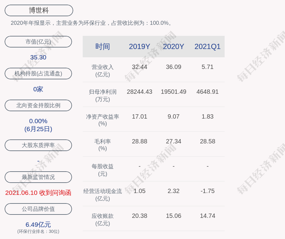 2020年年报显示,博世科的主营业务为环保行业,占营收比例为:100.0%。