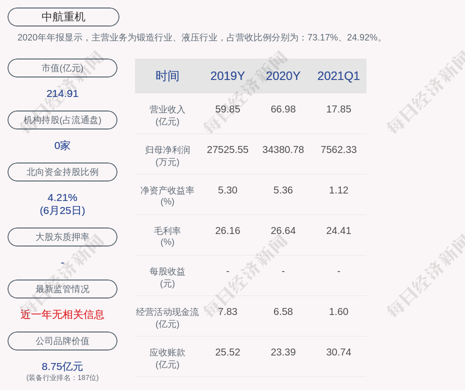 2020年年报显示,中航重机的主营业务为锻造行业、液压行业,占营收比例分别为:73.17%、24.92%。