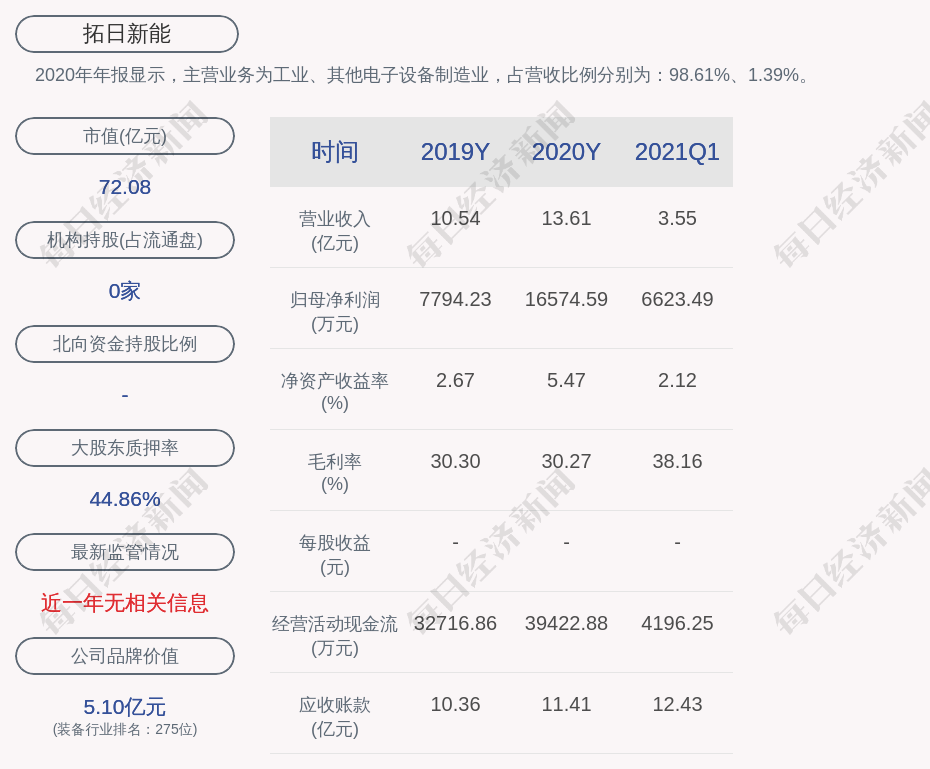 2020年年报显示,拓日新能的主营业务为工业、其他电子设备制造业,占营收比例分别为:98.61%、1.39%。