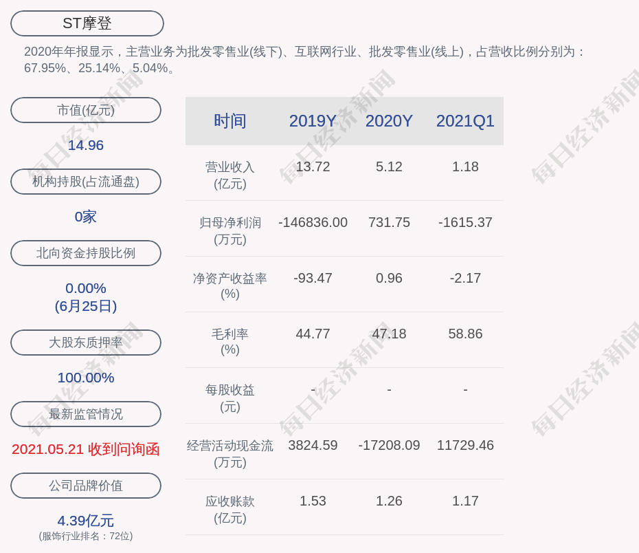 2020年年报显示,ST摩登的主营业务为批发零售业(线下)、互联网行业、批发零售业(线上),占营收比例分别为:67.95%、25.14%、5.04%。