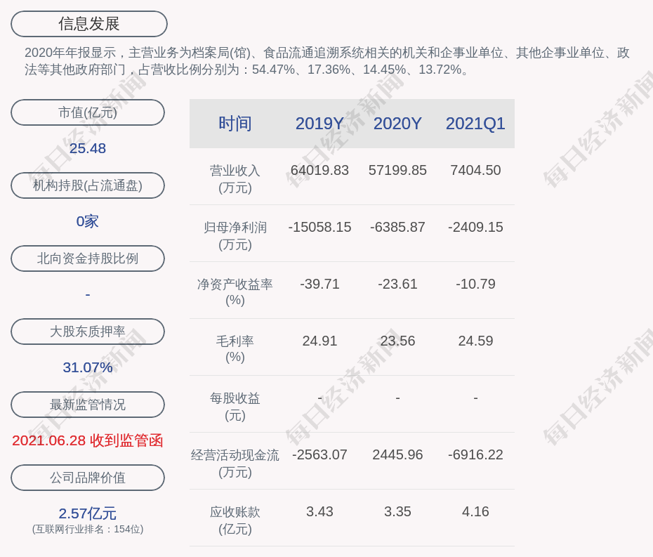 2020年年报显示,信息发展的主营业务为档案局(馆)、食品流通追溯系统相关的机关和企事业单位、其他企事业单位、政法等其他政府部门,占营收比例分别为:54.47%、17.36%、14.45%、13.72%。