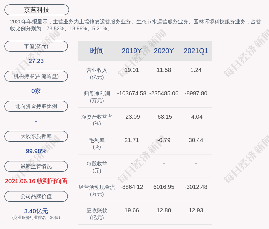 2020年年报显示,京蓝科技的主营业务为土壤修复运营服务业务、生态节水运营服务业务、园林环境科技服务业务,占营收比例分别为:73.52%、18.96%、5.21%。