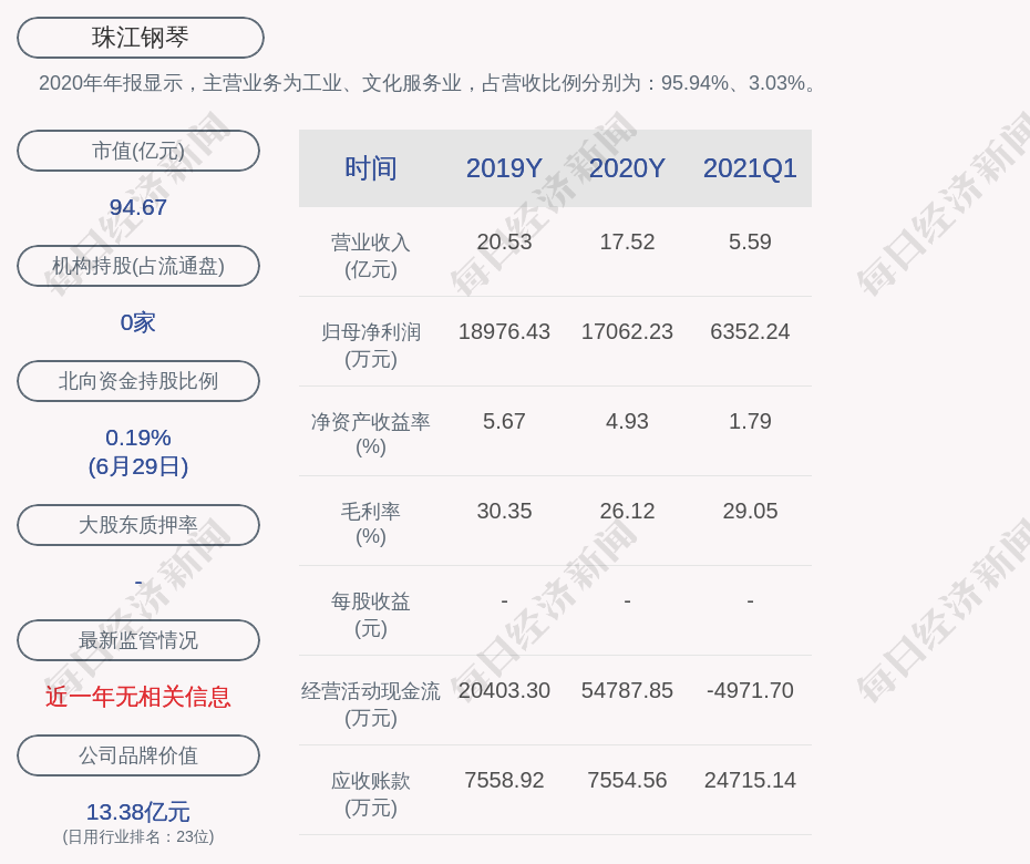 2020年年报显示,珠江钢琴的主营业务为工业、文化服务业,占营收比例分别为:95.94%、3.03%。