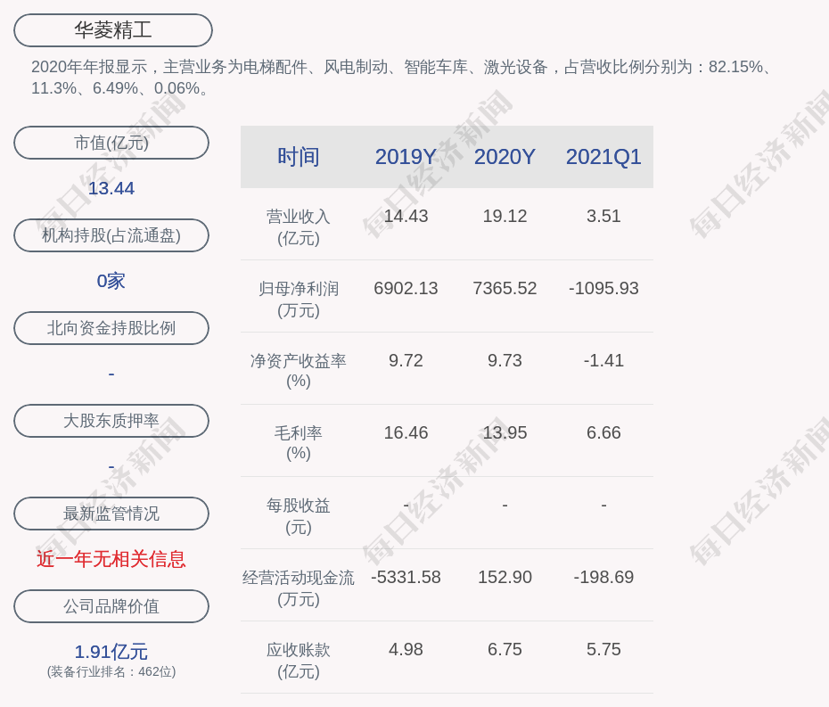 2020年年报显示,华菱精工的主营业务为电梯配件、风电制动、智能车库、激光设备,占营收比例分别为:82.15%、11.3%、6.49%、0.06%。