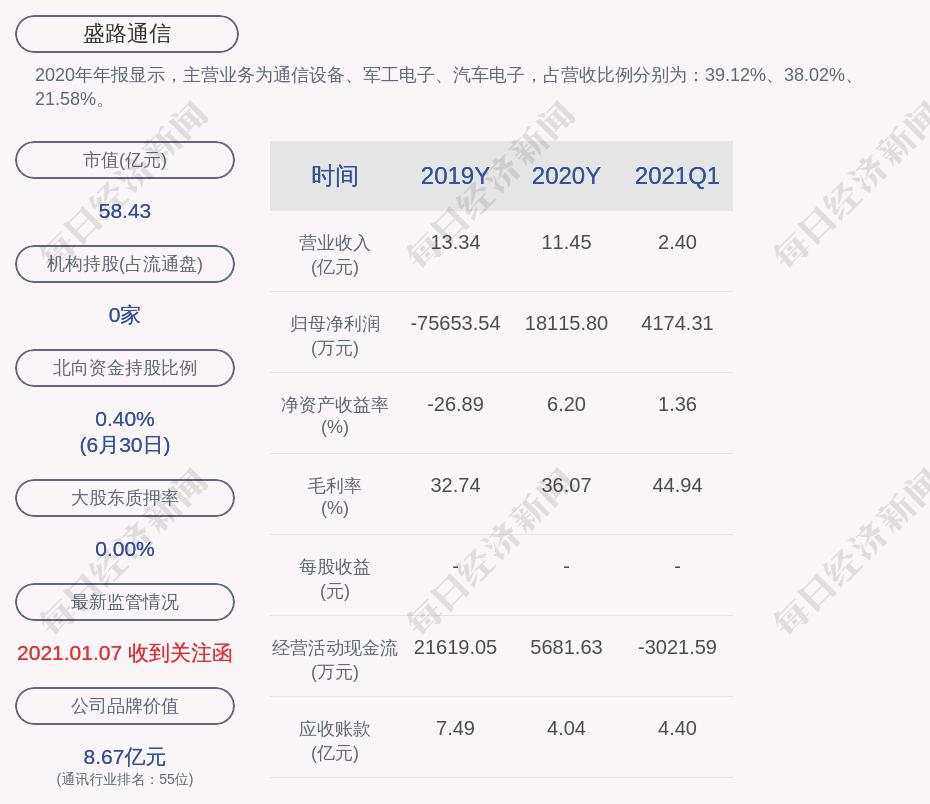 2020年年报显示,盛路通信的主营业务为通信设备、军工电子、汽车电子,占营收比例分别为:39.12%、38.02%、21.58%。