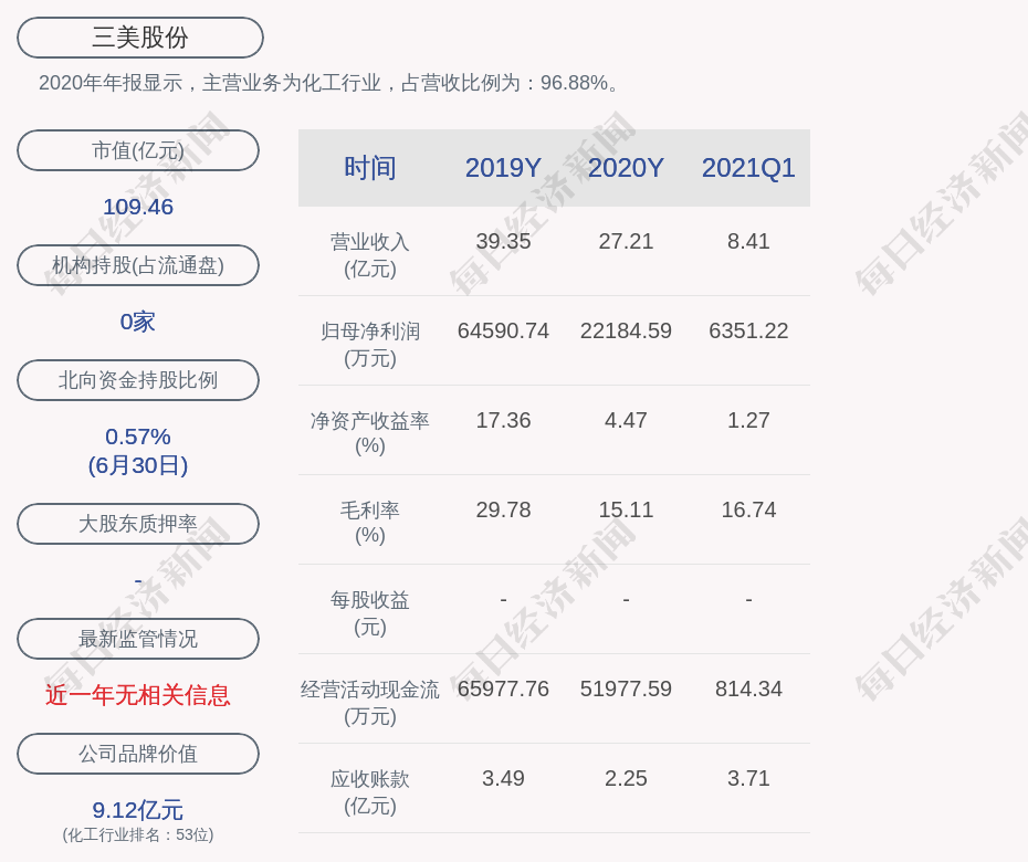 2020年年报显示,三美股份的主营业务为化工行业,占营收比例为:96.88%。