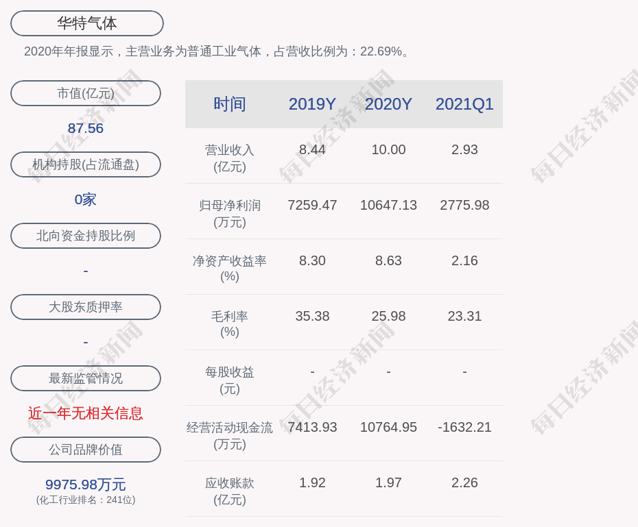 2. 根据各大券商对华特气体净利润的预测,华特气体2021年半年度预测净利润平均值为7521.43万元。华特气体去年同期净利润为4283万元。更多关键信息,请搜索“道达号”。