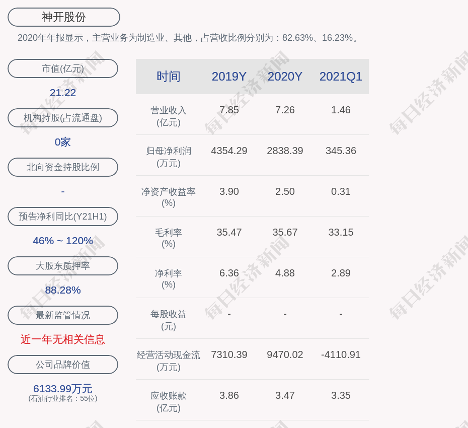 2020年年报显示,神开股份的主营业务为制造业、其他,占营收比例分别为:82.63%、16.23%。