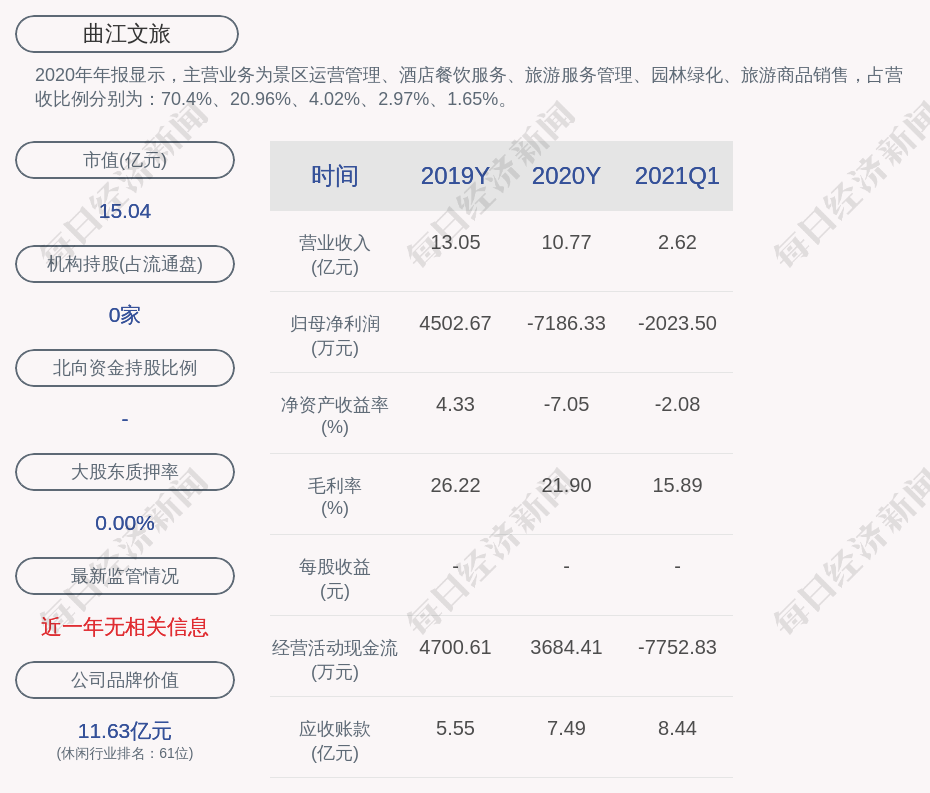 2020年年报显示,曲江文旅的主营业务为景区运营管理、酒店餐饮服务、旅游服务管理、园林绿化、旅游商品销售,占营收比例分别为:70.4%、20.96%、4.02%、2.97%、1.65%。