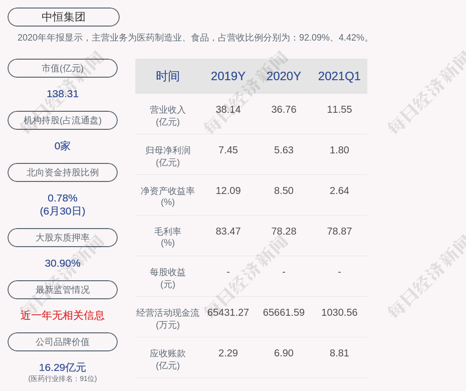 2020年年报显示,中恒集团的主营业务为医药制造业、食品,占营收比例分别为:92.09%、4.42%。