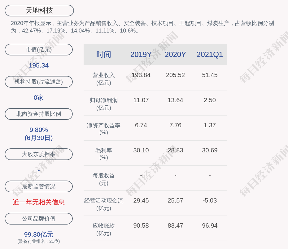 2020年年报显示,天地科技的主营业务为产品销售收入、安全装备、技术项目、工程项目、煤炭生产,占营收比例分别为:42.47%、17.19%、14.04%、11.11%、10.6%。