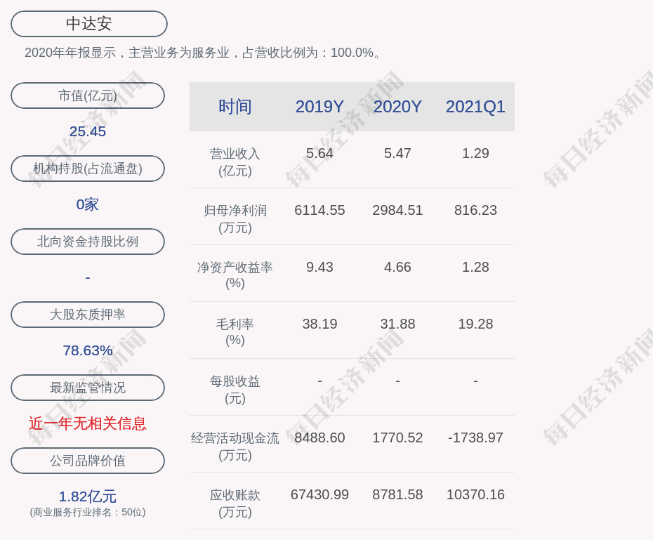 2020年年报显示,中达安的主营业务为服务业,占营收比例为:100.0%。