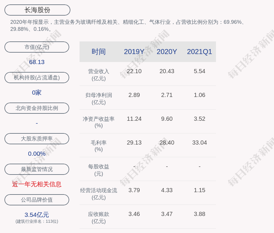 2020年年报显示,长海股份的主营业务为玻璃纤维及相关、精细化工、气体行业,占营收比例分别为:69.96%、29.88%、0.16%。