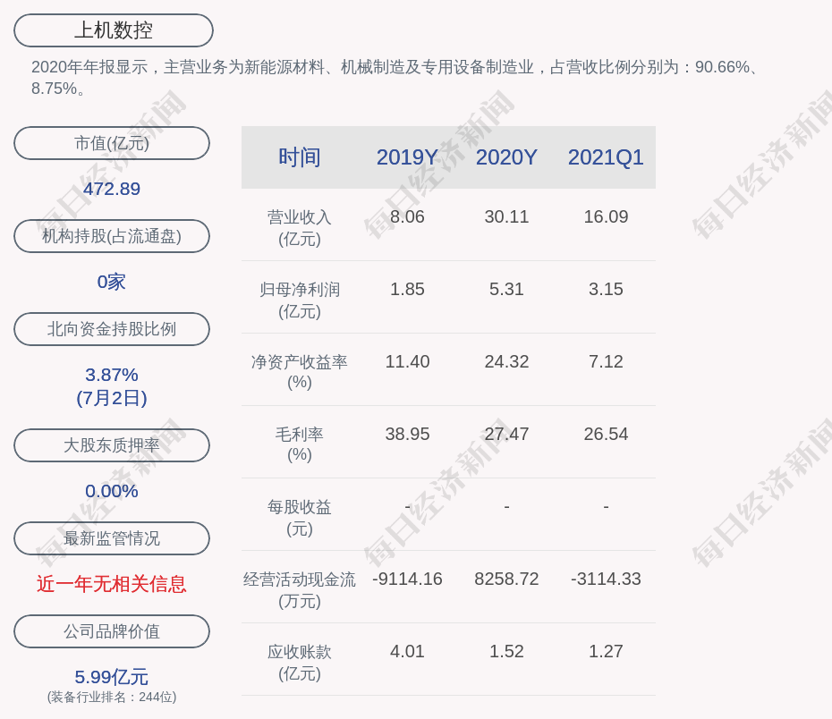 2020年年报显示,上机数控的主营业务为新能源材料、机械制造及专用设备制造业,占营收比例分别为:90.66%、8.75%。