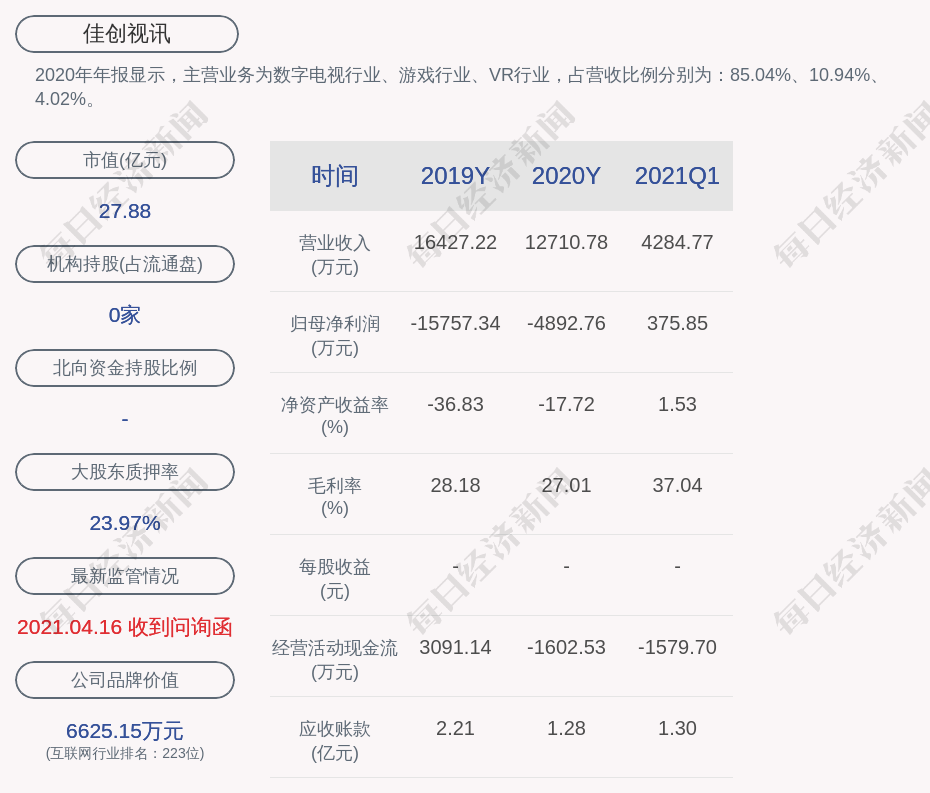 2020年年报显示,佳创视讯的主营业务为数字电视行业、游戏行业、VR行业,占营收比例分别为:85.04%、10.94%、4.02%。