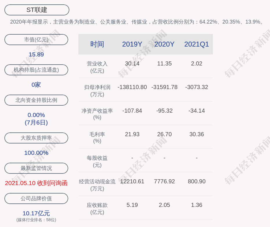 2020年年报显示,ST联建的主营业务为制造业、公关服务业、传媒业。