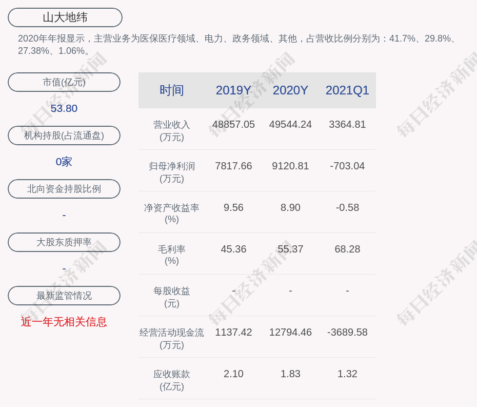 2020年年报显示,山大地纬的主营业务为医保医疗领域、电力、政务领域、其他,占营收比例分别为:41.7%、29.8%、27.38%、1.06%。