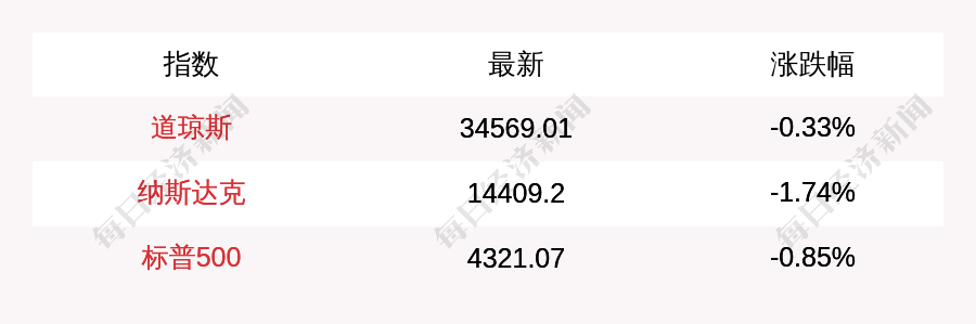 每经AI快讯:北京时间7月8日21:30,道琼斯开盘下跌112.78点,跌幅为0.33%,报34569.01点;纳斯达克开盘下跌255.86点,跌幅为1.74%,报14409.2点;标普500开盘下跌37.06点,跌幅为0.85%,报4321.07点;富时中国A50指数期货下跌13.0点,跌幅为0.08%,报16547.0点。
