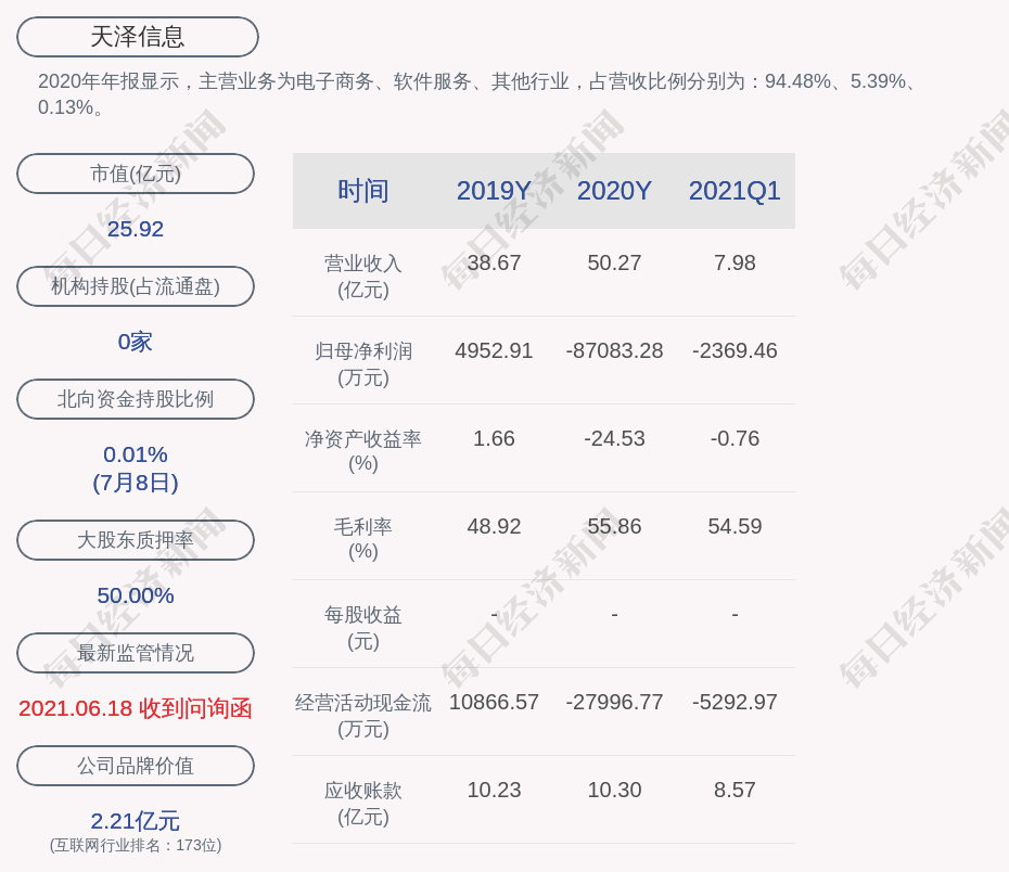 2020年年报显示,天泽信息的主营业务为电子商务、软件服务、其他行业,占营收比例分别为:94.48%、5.39%、0.13%。