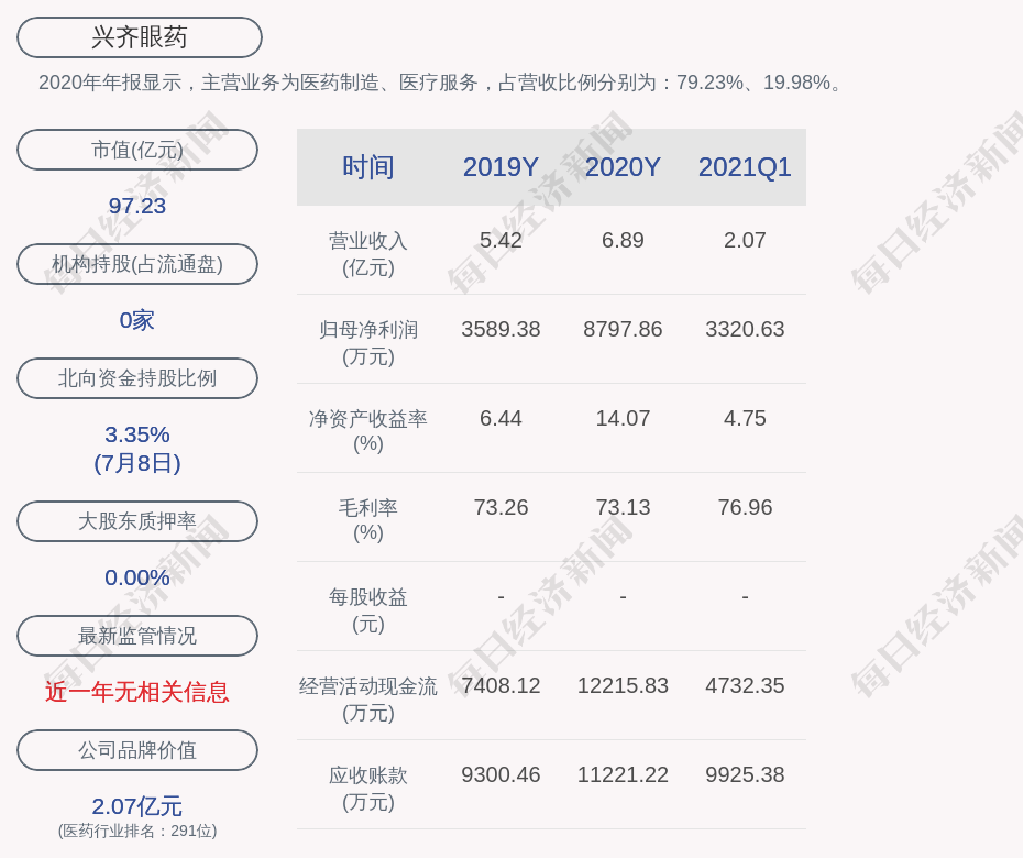 2020年年报显示,兴齐眼药的主营业务为医药制造、医疗服务,占营收比例分别为:79.23%、19.98%。