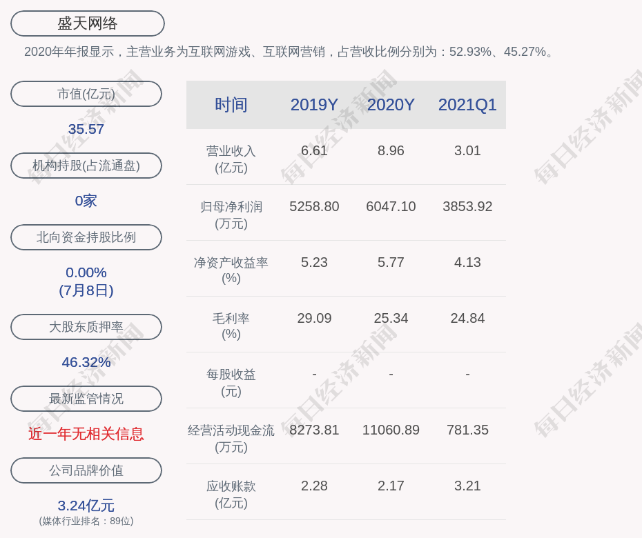 2020年年报显示,盛天网络的主营业务为互联网游戏、互联网营销。