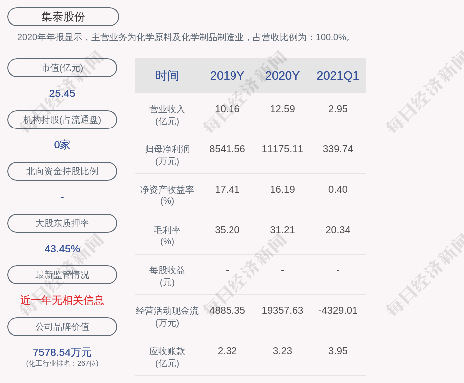 2020年年报显示,集泰股份的主营业务为化学原料及化学制品制造业,占营收比例为:100.0%。