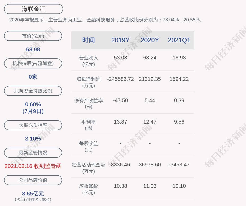 2020年年报显示,海联金汇的主营业务为工业、金融科技服务。