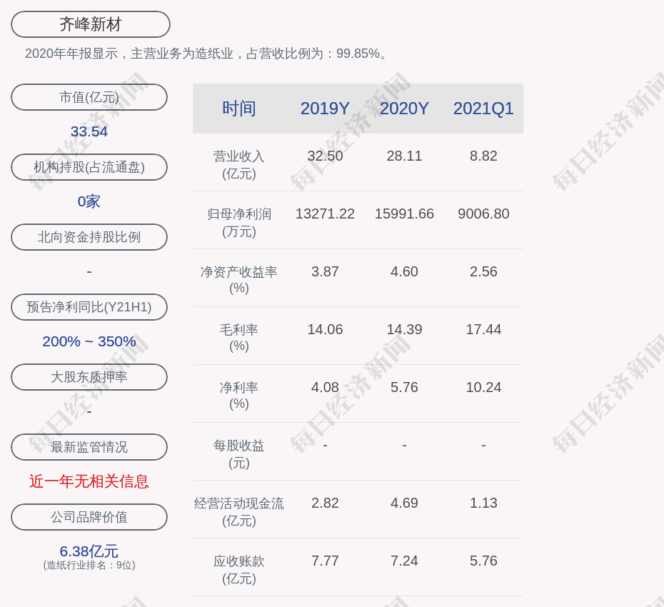 2020年年报显示,齐峰新材的主营业务为造纸业,占营收比例为:99.85%。