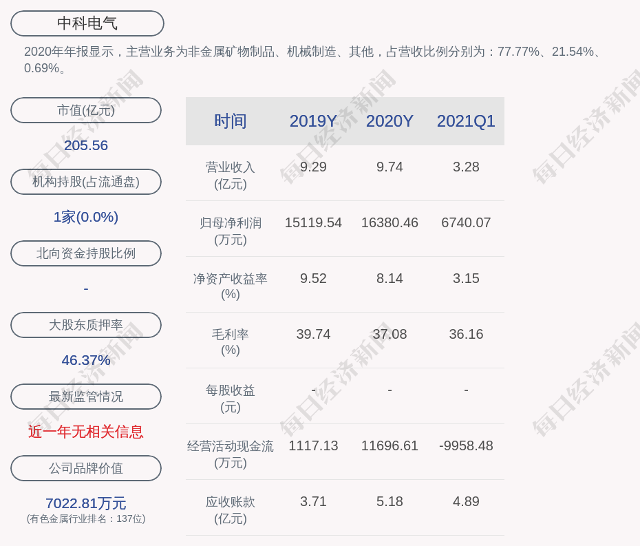 2020年年报显示,中科电气的主营业务为非金属矿物制品、机械制造、其他,占营收比例分别为:77.77%、21.54%、0.69%。