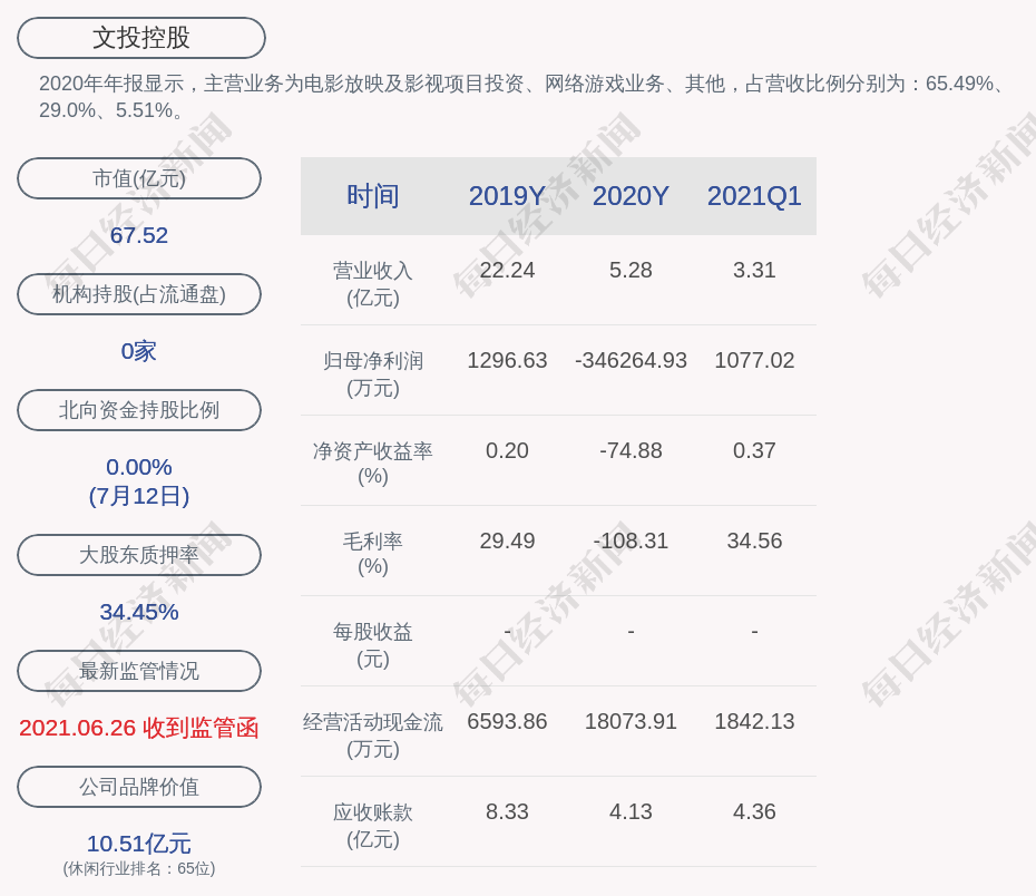 2020年年报显示,文投控股的主营业务为电影放映及影视项目投资、网络游戏业务、其他,占营收比例分别为:65.49%、29.0%、5.51%。