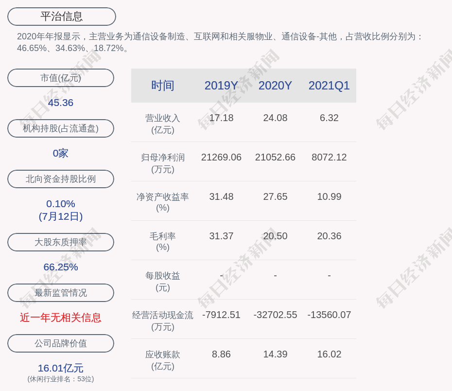 2020年年报显示,平治信息的主营业务为通信设备制造、互联网和相关服物业、通信设备-其他。