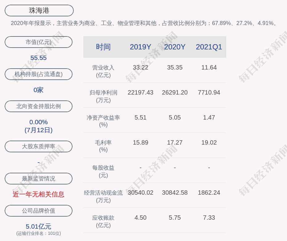 2020年年报显示,珠海港的主营业务为商业、工业、物业管理和其他,占营收比例分别为:67.89%、27.2%、4.91%。