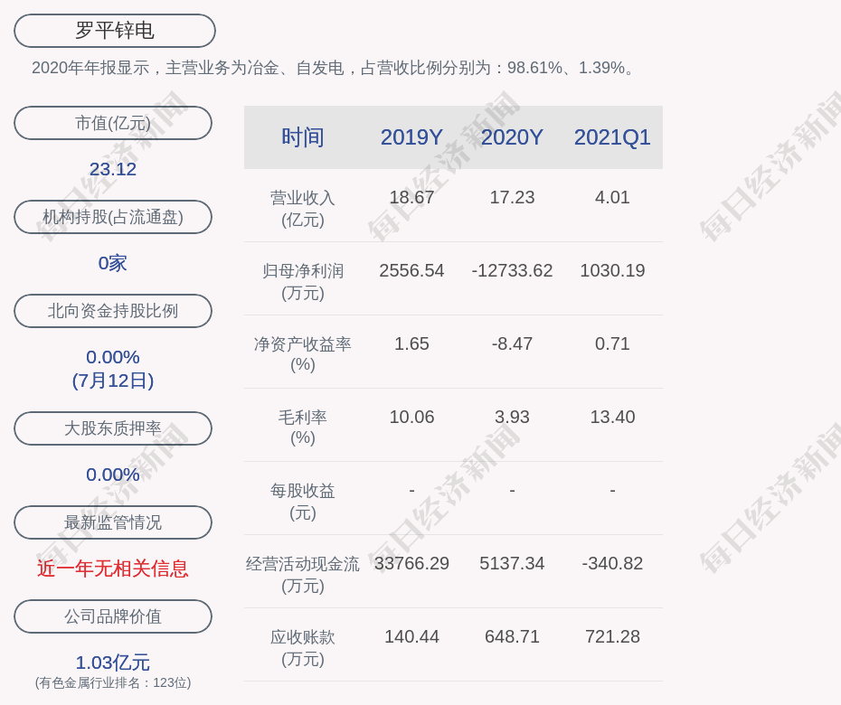 2020年年报显示,罗平锌电的主营业务为冶金、自发电,占营收比例分别为:98.61%、1.39%。