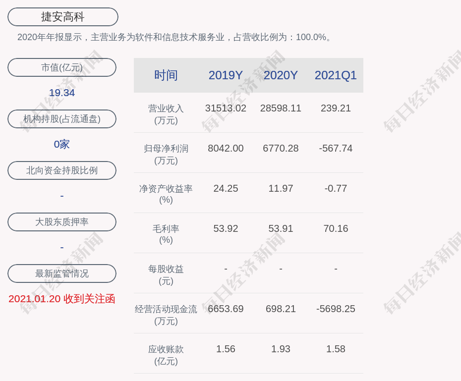 2020年年报显示,捷安高科的主营业务为软件和信息技术服务业,占营收比例为:100.0%。