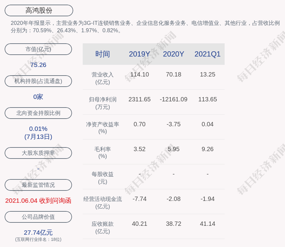 2020年年报显示,高鸿股份的主营业务为3G-IT连锁销售业务、企业信息化服务业务、电信增值业、其他行业,占营收比例分别为:70.59%、26.43%、1.97%、0.82%。