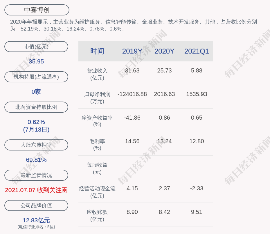 2020年年报显示,中嘉博创的主营业务为维护服务、信息智能传输、金服业务、技术开发服务、其他,占营收比例分别为:52.19%、30.18%、16.24%、0.78%、0.6%。