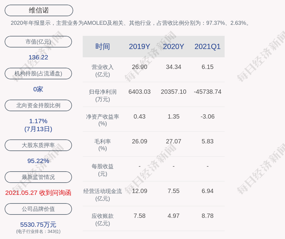 2020年年报显示,维信诺的主营业务为AMOLED及相关、其他行业,占营收比例分别为:97.37%、2.63%。
