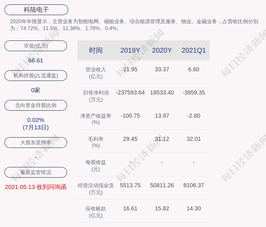 2020年年报显示,科陆电子的主营业务为智能电网、储能业务、综合能源管理及服务、物业、金融业务。