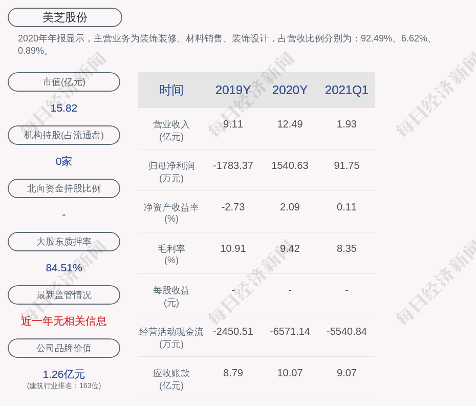 2020年年报显示,美芝股份的主营业务为装饰装修、材料销售、装饰设计,占营收比例分别为:92.49%、6.62%、0.89%。