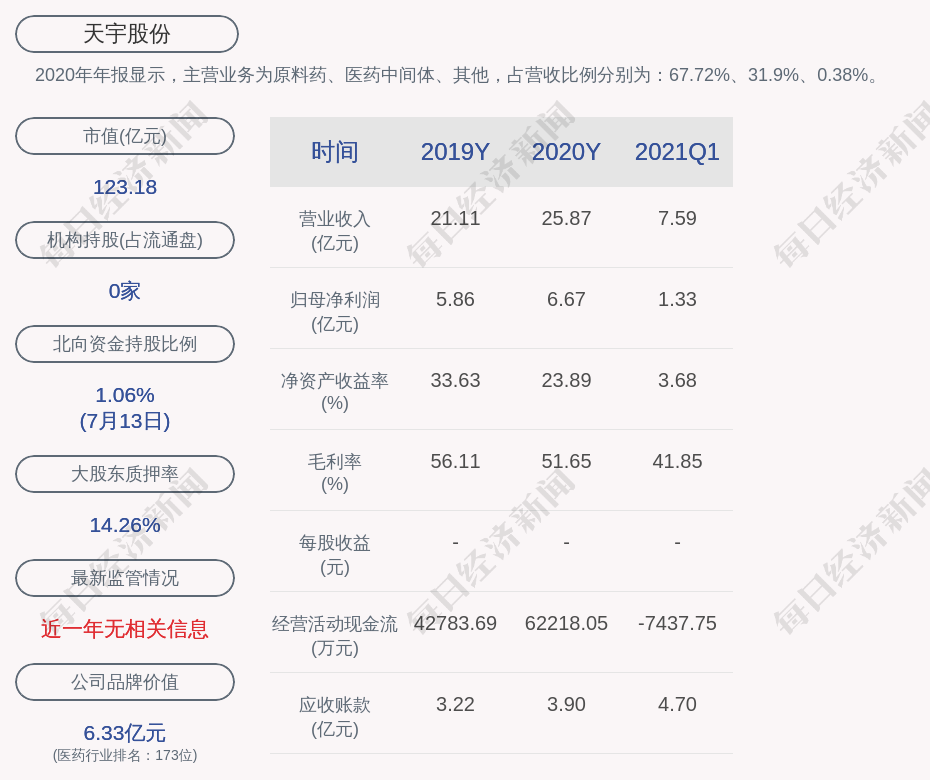 2020年年报显示,天宇股份的主营业务为原料药、医药中间体、其他,占营收比例分别为:67.72%、31.9%、0.38%。
