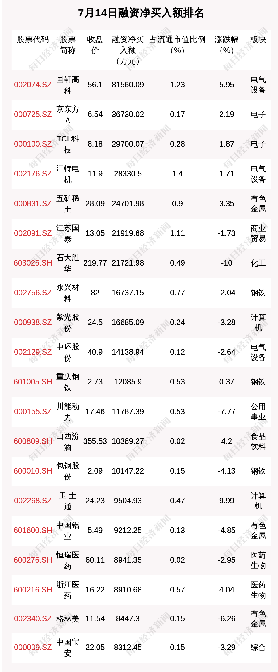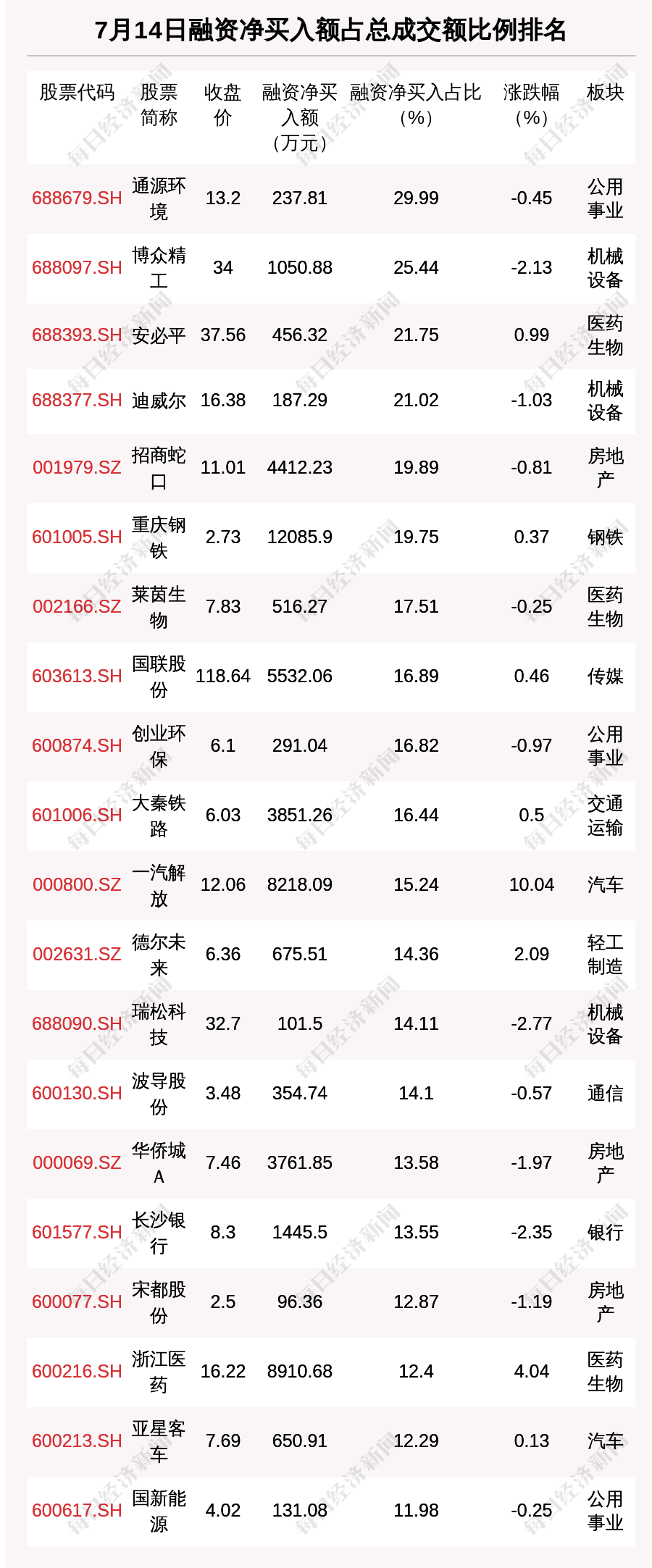 7月14日两市共有956只个股有融资资金净买入。共有29只股票融资净买入额占总成交金额比例超10%,其中通源环境、博众精工、安必平排名前三,占比分别为29.99%、25.44%、21.75%。