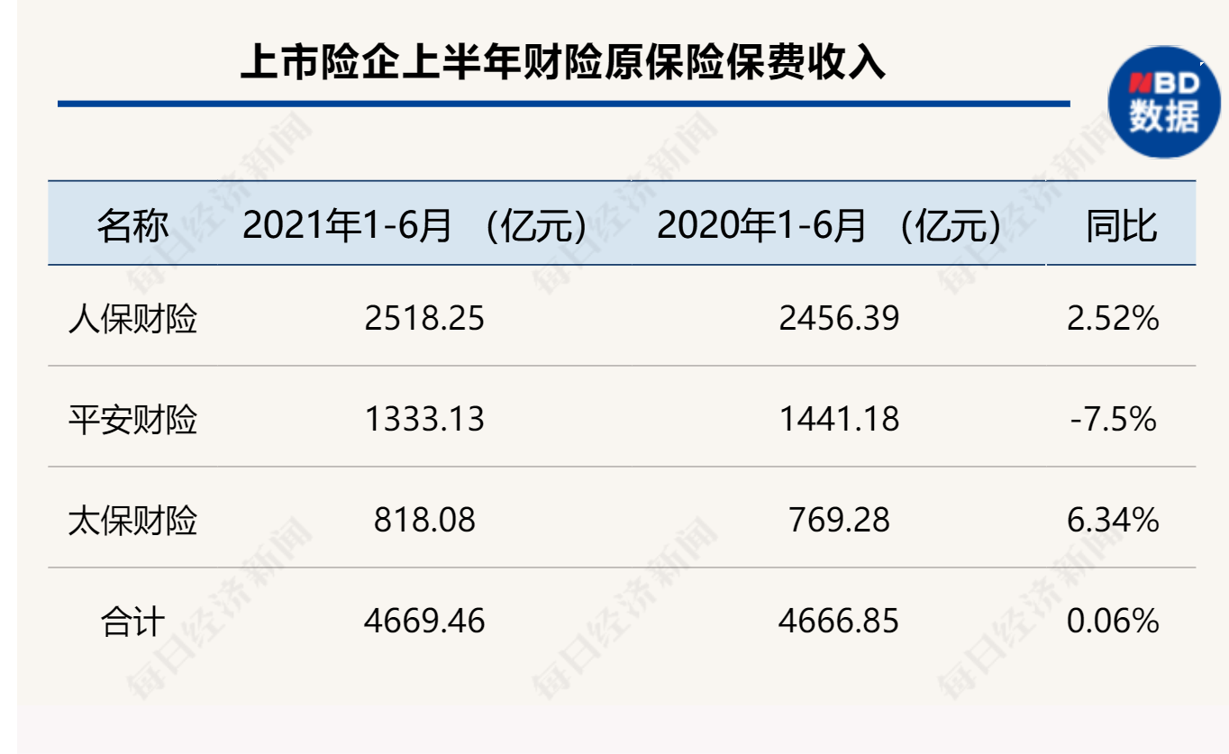 《每日经济新闻》记者统计显示,上述三家上市险企上半年财险合计实现原保险保费收入4669.46亿元,同比微增0.06%。