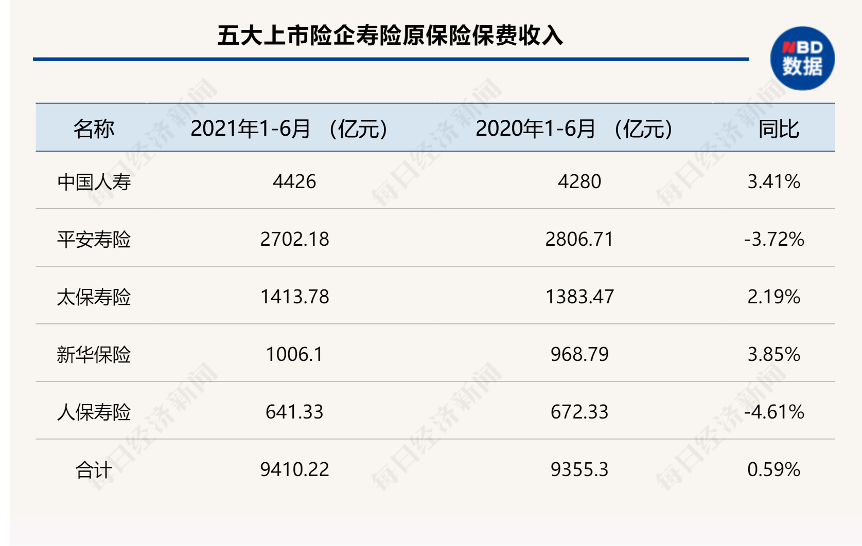 《每日经济新闻》记者统计显示,截至2021年6月30日,中国人寿、中国平安、中国人保、中国太保和新华保险五大A股上市险企合计实现保费收入约15301.34亿元,同比微增0.64%。
