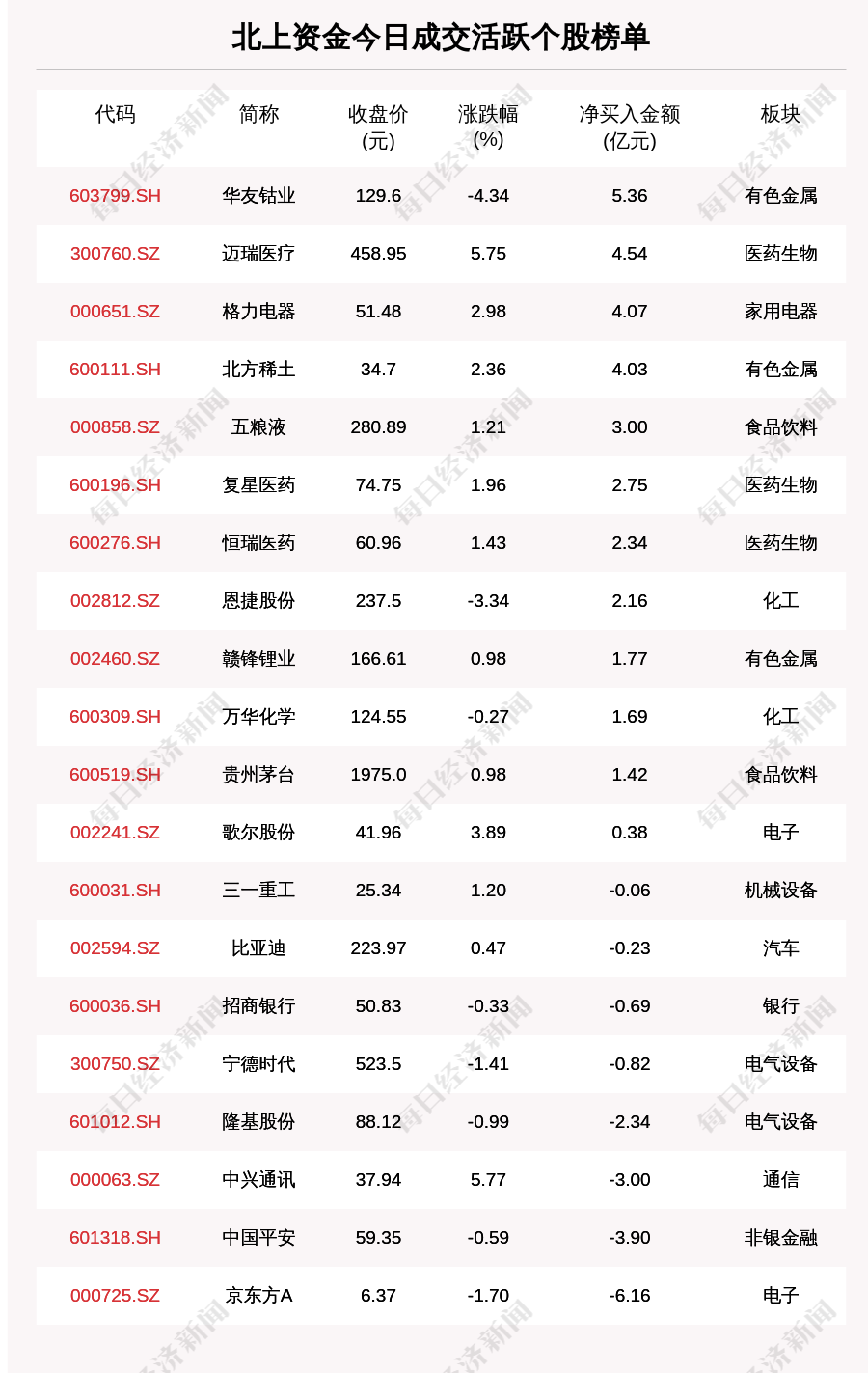 7月19日,北上资金成交活跃个股榜单中,净买入个股共12只,金额最多的是华友钴业(603799.SH,收盘价:129.6元),净买入5.355亿元;净卖出个股共8只,金额最多的是京东方A(000725.SZ,收盘价:6.37元),净卖出6.165亿元。