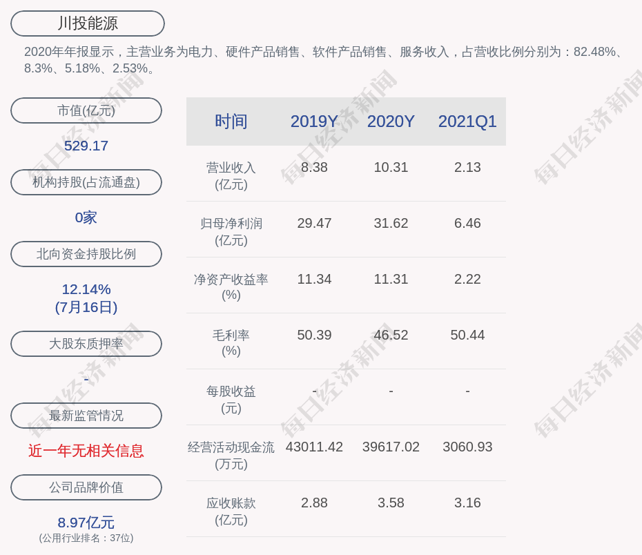 2020年年报显示,川投能源的主营业务为电力、硬件产品销售、软件产品销售、服务收入,占营收比例分别为:82.48%、8.3%、5.18%、2.53%。