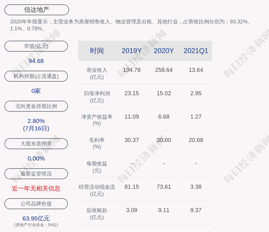 2020年年报显示,信达地产的主营业务为房屋销售收入、物业管理及出租、其他行业,占营收比例分别为:93.32%、1.1%、0.78%。