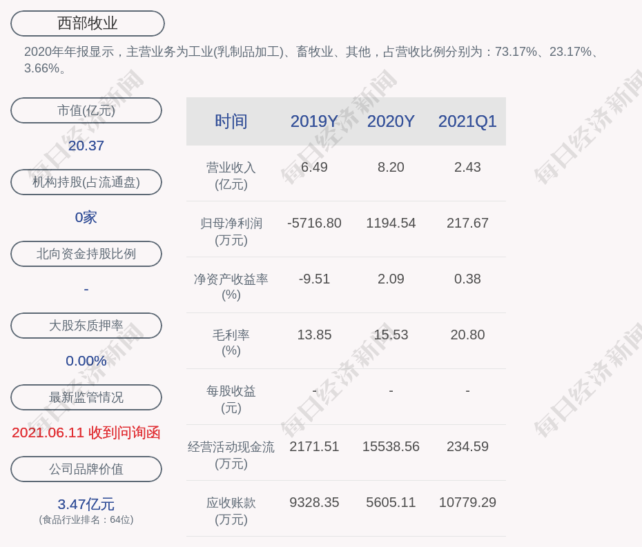2020年年报显示,西部牧业的主营业务为工业(乳制品加工)、畜牧业、其他,占营收比例分别为:73.17%、23.17%、3.66%。