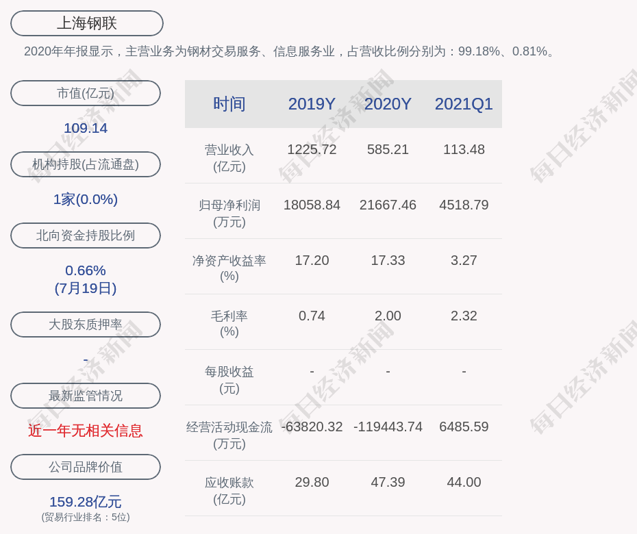 2020年年报显示,上海钢联的主营业务为钢材交易服务、信息服务业,占营收比例分别为:99.18%、0.81%。